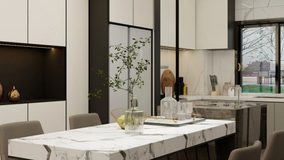 廚房柜體的設計是“美學表達”與“功能落地”的結合體,既以簡約高級的視覺呈現(xiàn)契合現(xiàn)代家居審美,又以精細化的收納與布局,為日常烹飪、用餐提供高效且舒適的體驗,最終讓餐廚空間成為家的 “質感生活容器”。