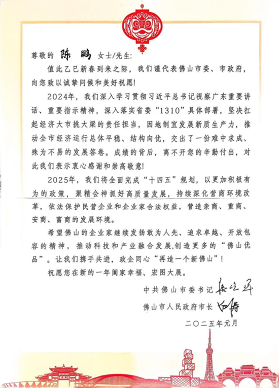 隨著乙已新春的鐘聲即將敲響,佛山市委、市政府向安晨集團(tuán)及董事長陳鵬先生致以誠摯的問候和美好的祝愿。在這辭舊迎新的時刻,安晨集團(tuán)作為佛山制造業(yè)的代表,不僅收獲了來自官方的肯定與祝福,更以其卓越的使命愿景和全方位的賦能體系,展現(xiàn)了在新一年度中再創(chuàng)輝煌的堅定決心。