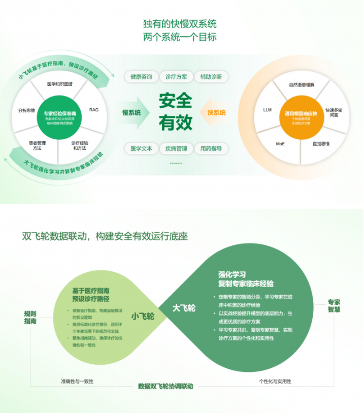 快系統(tǒng)調用多基座大語言模型實現(xiàn)自然語義交互,解決“聽懂人話”的問題;慢系統(tǒng)則基于RAG檢索增強生成技術,依托自有醫(yī)學知識圖譜、專家共識等資源,對快系統(tǒng)的輸出進行校驗修正,徹底規(guī)避通用AI“一本正經胡說八道”的風險。同時,所有AI生成的內容都會由醫(yī)生最終把關。