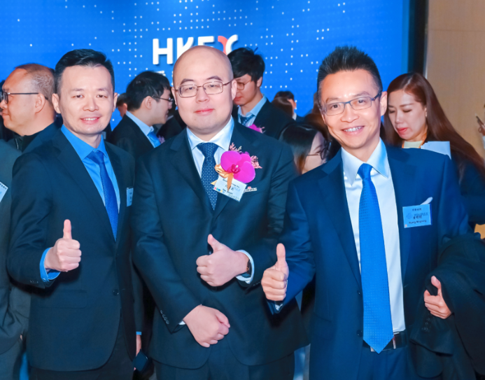 MiniMax 創(chuàng)始人兼 CEO 閆俊杰(中)與明勢創(chuàng)投創(chuàng)始合伙人黃明明(右)、明勢創(chuàng)投合伙人夏令(左)在MiniMax港交所主板上市儀式上